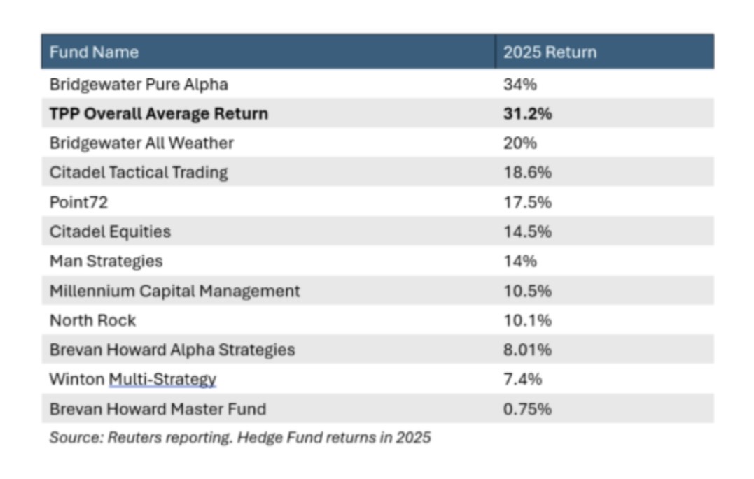 TPP’s 2025 review shows that across multiple strategies, performance stacked up remarkably well when placed alongside elite active managers, but without the traditional hedge fund drawbacks.