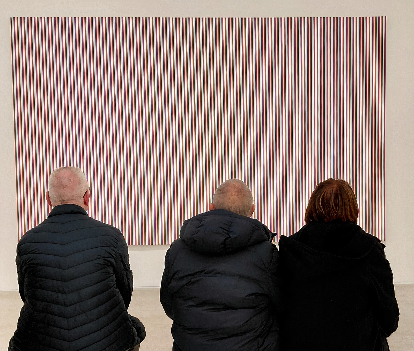 Inside, the exhibition presents Riley’s vertical bands, diagonals, waves and curves in a sequence that rewards slow looking. Harry photographed the galleries for reference, capturing how visitors of all ages respond physically to the rhythm of the works—leaning in, stepping back, tilting their heads to feel the pull of the compositions.