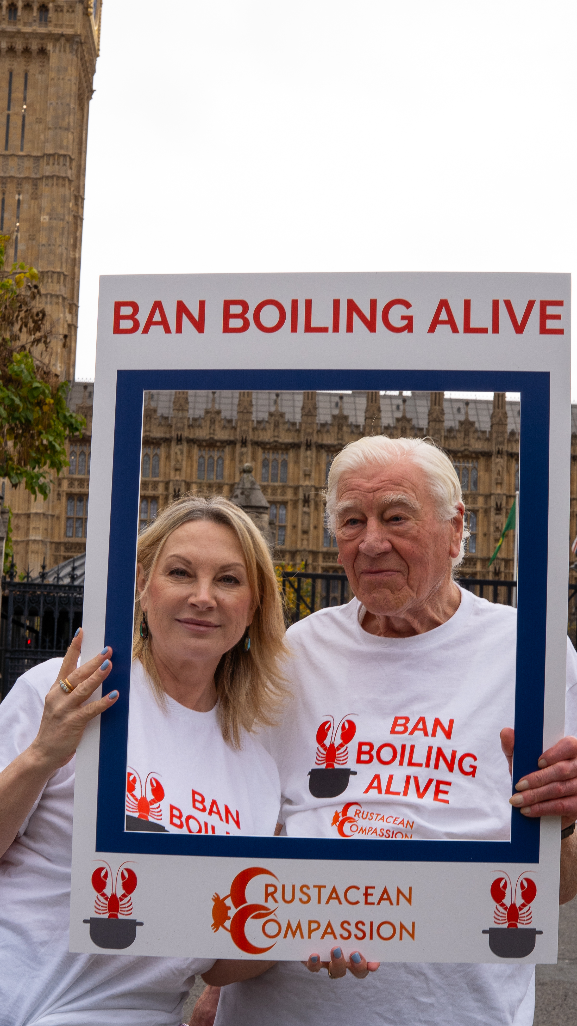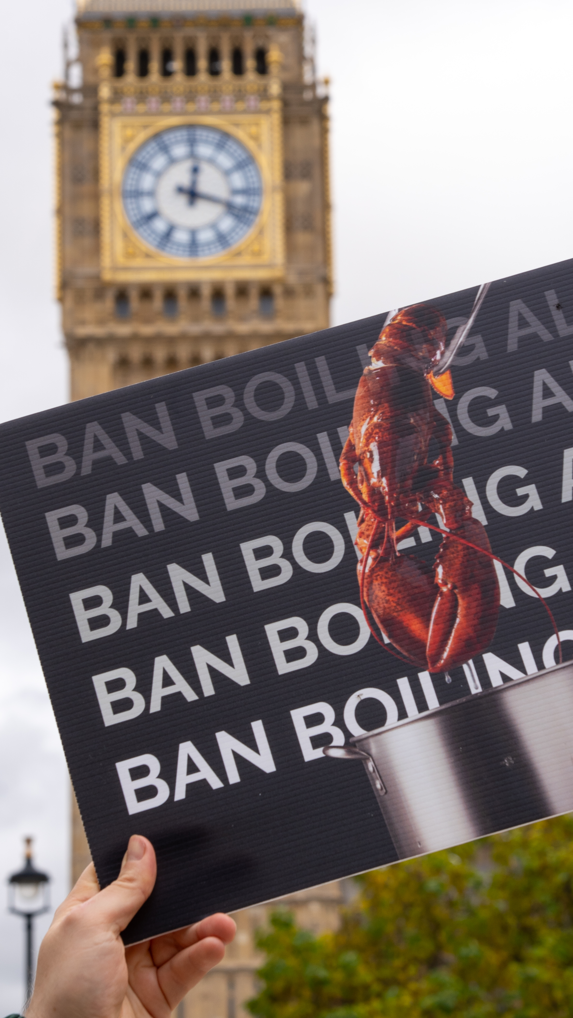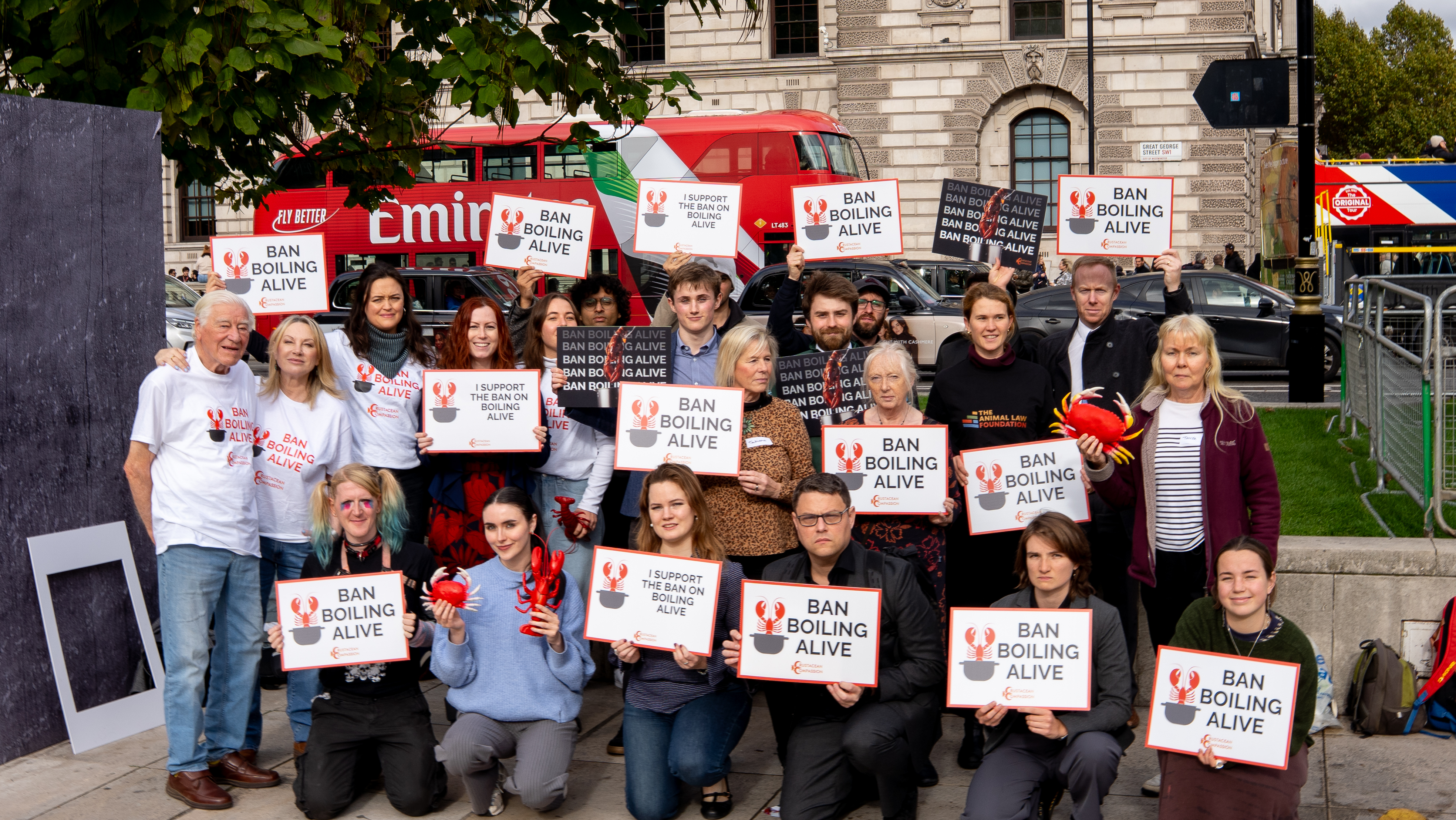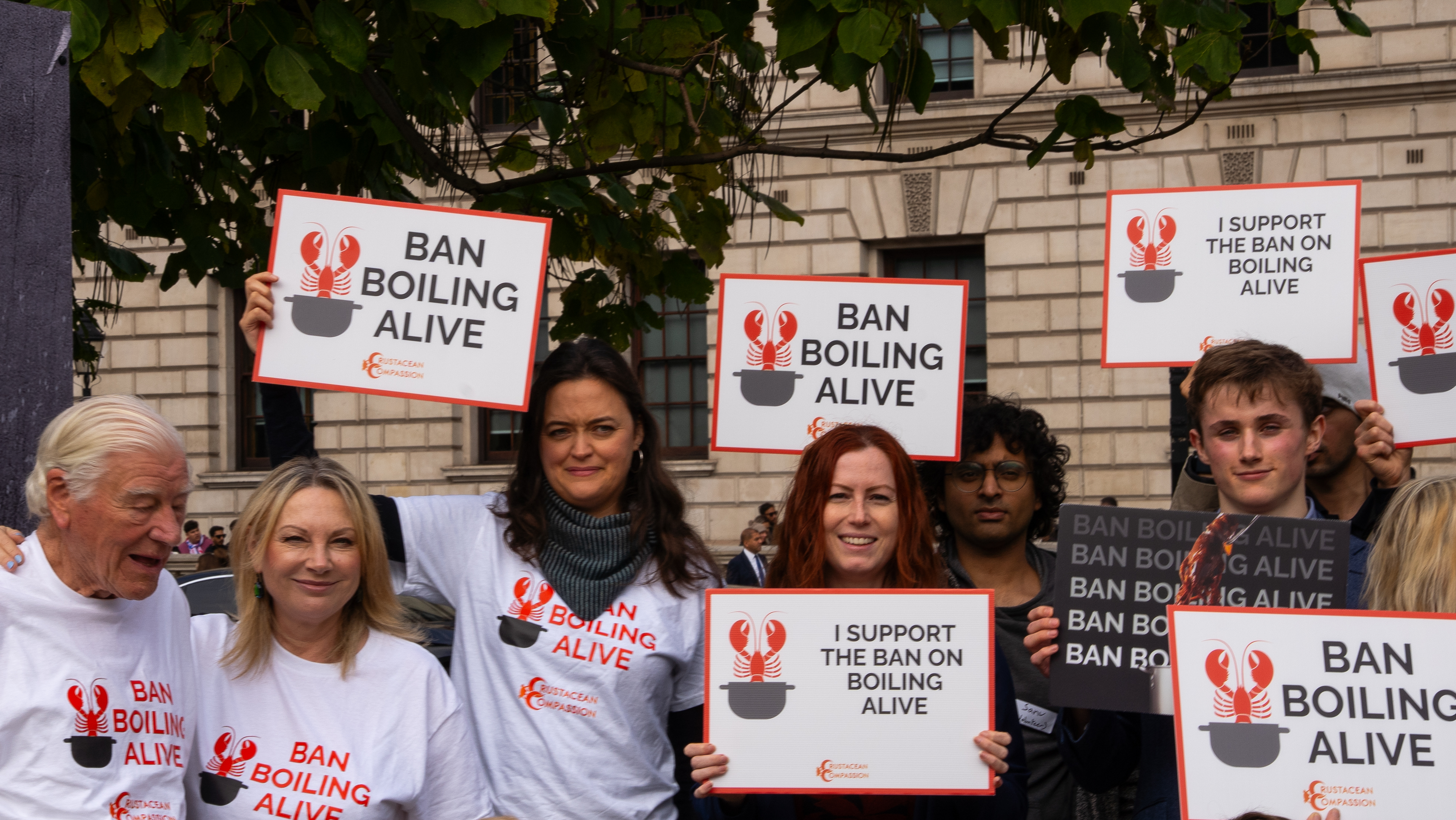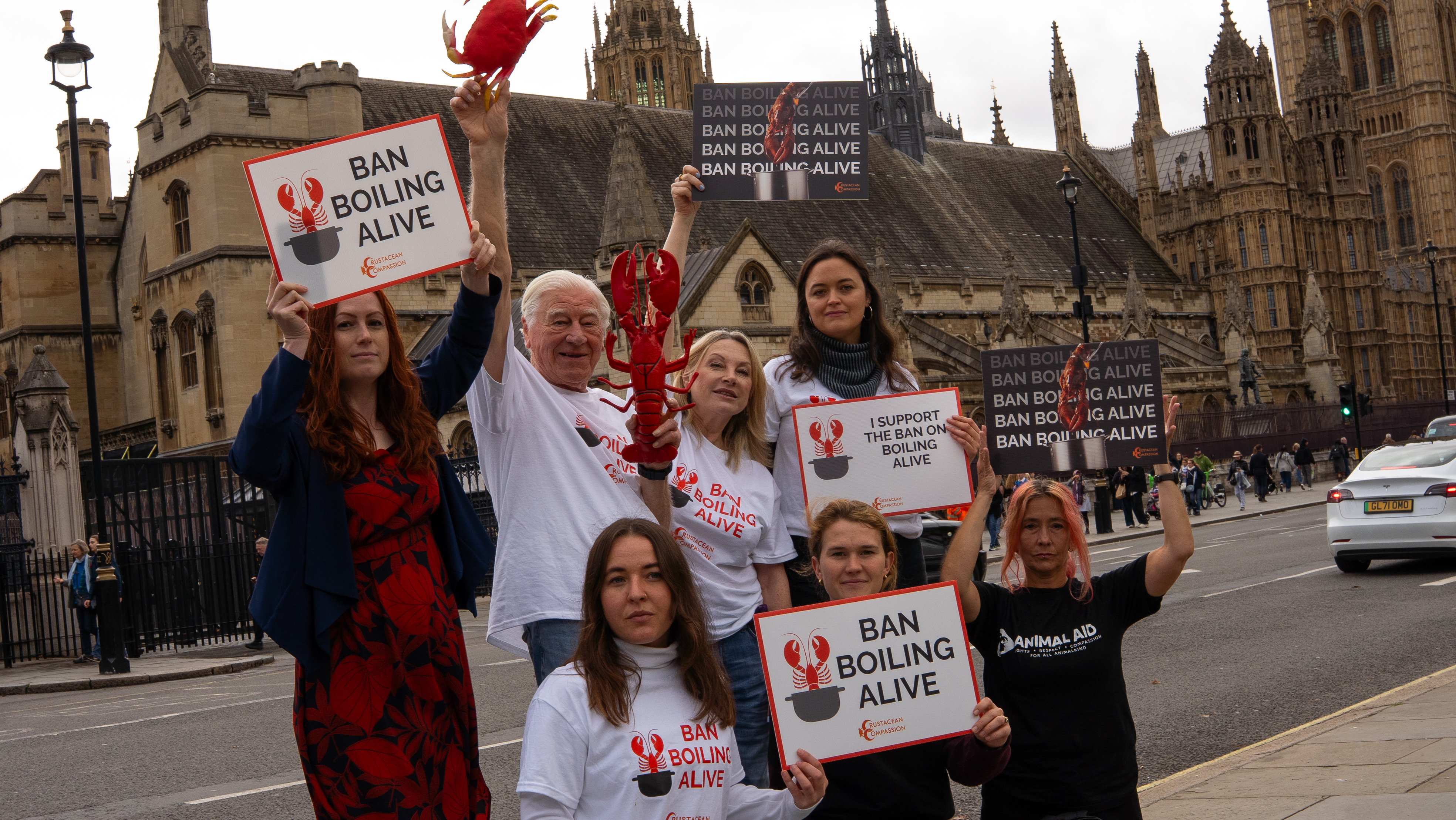 Led by Crustacean Compassion, today activists, celebrities, and animal welfare organisations - including Compassion in World Farming, Animal Aid, Humane World for Animals and the Animal Law Foundation - gathered outside Westminster to turn up the heat on the UK government. Their message to newly appointed Defra Secretary Emma Reynolds was clear: to outlaw the painful and outdated practice of boiling sentient decapod crustaceans like crabs, prawns, and lobsters alive.