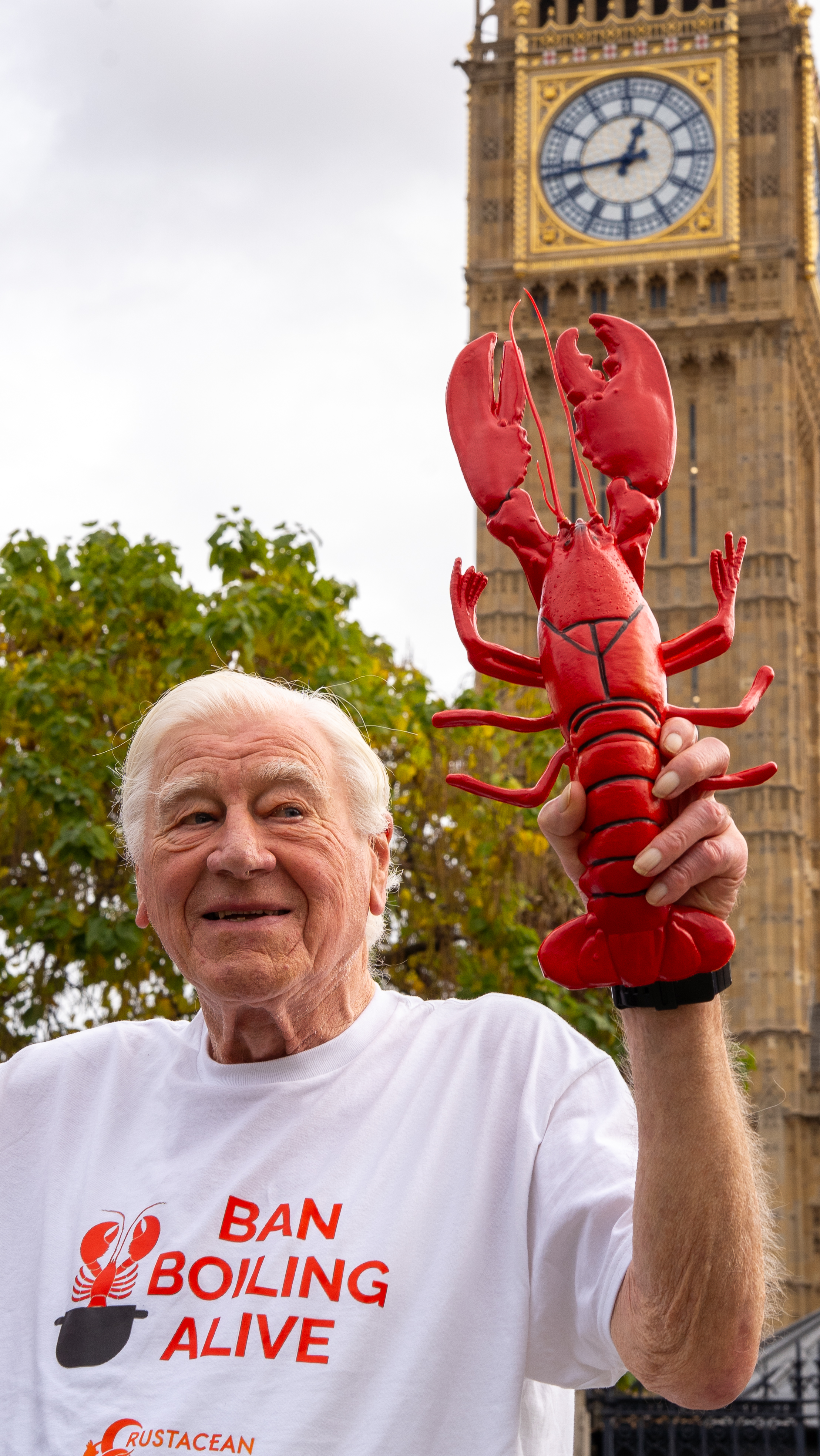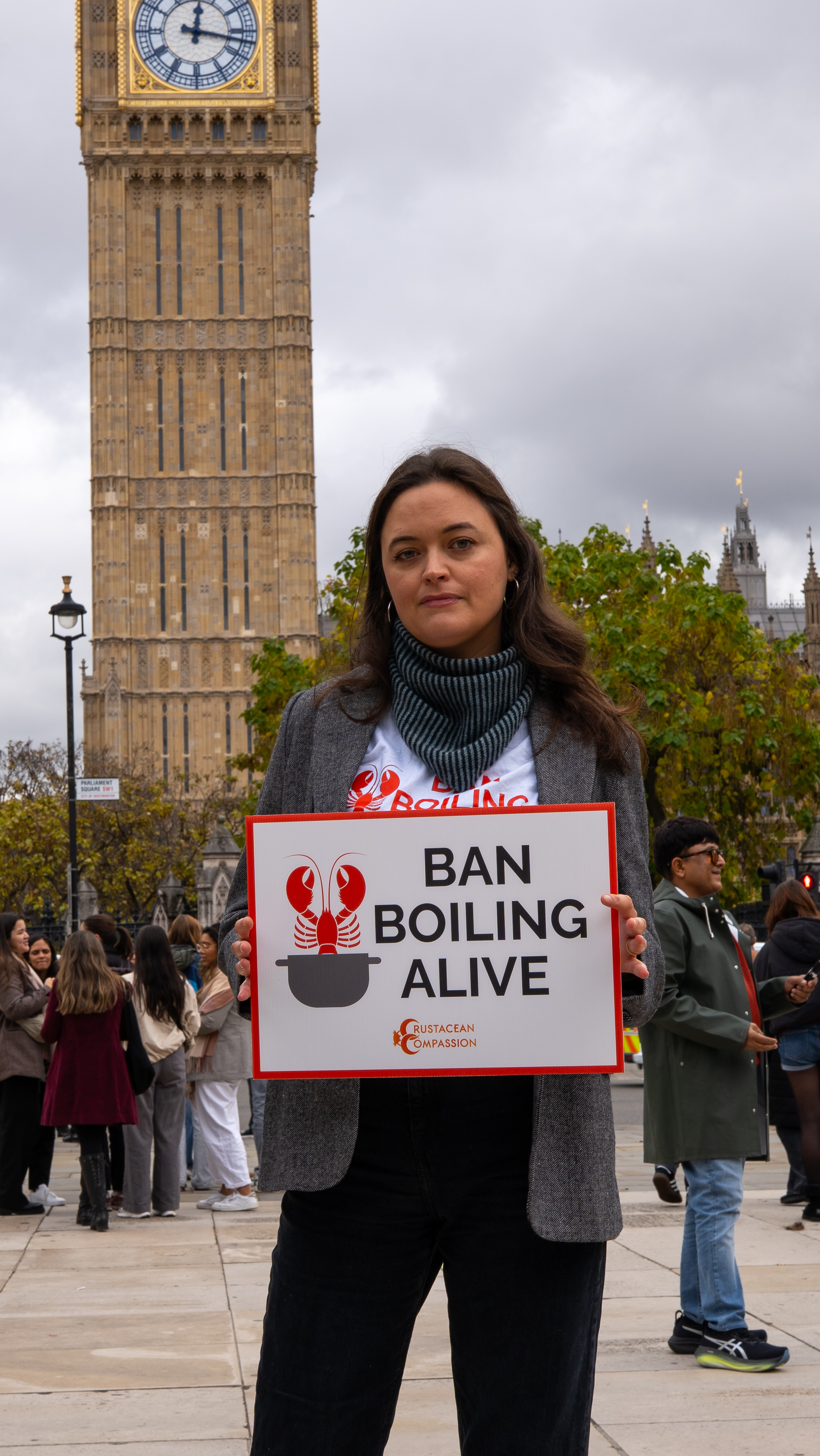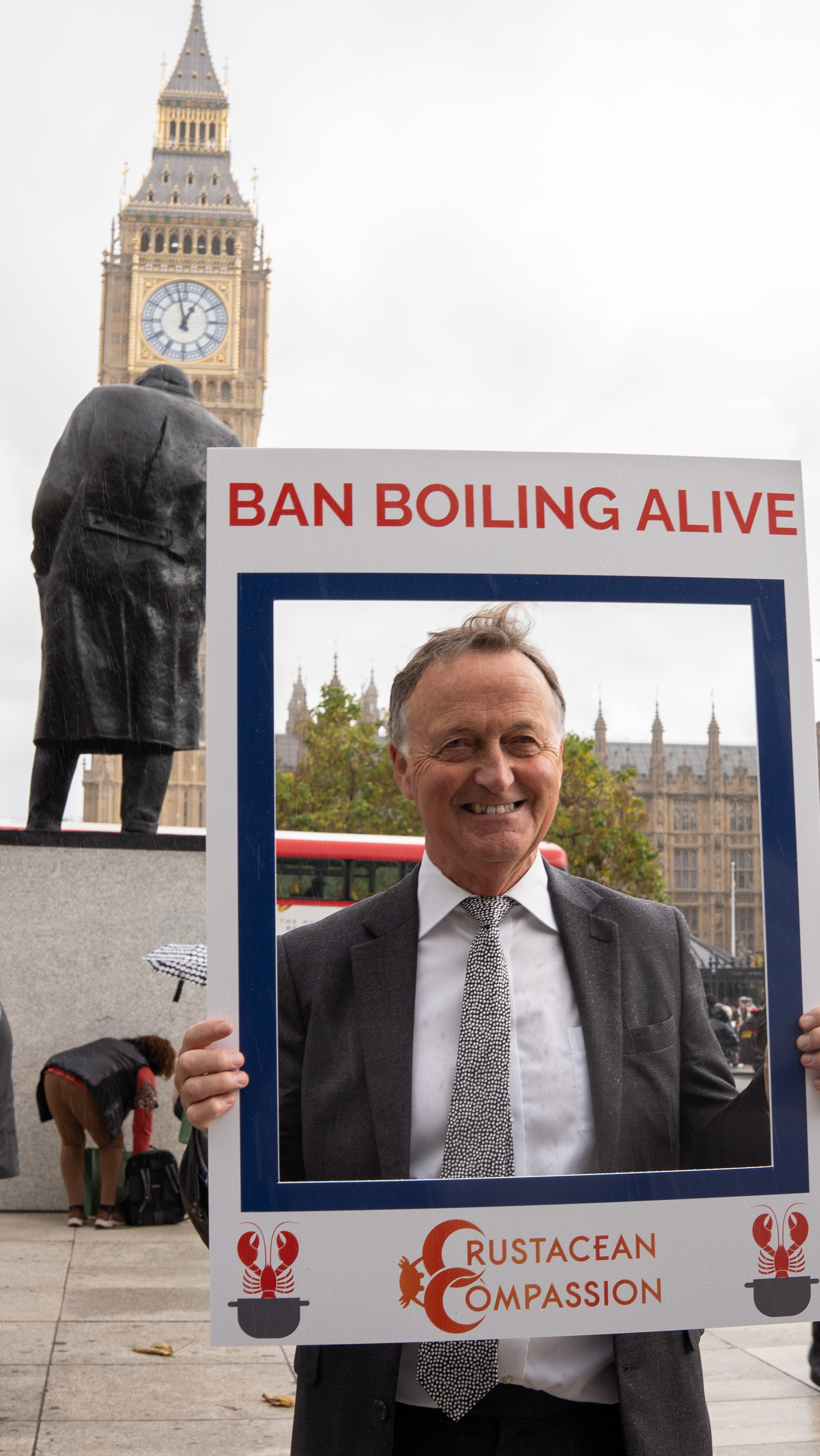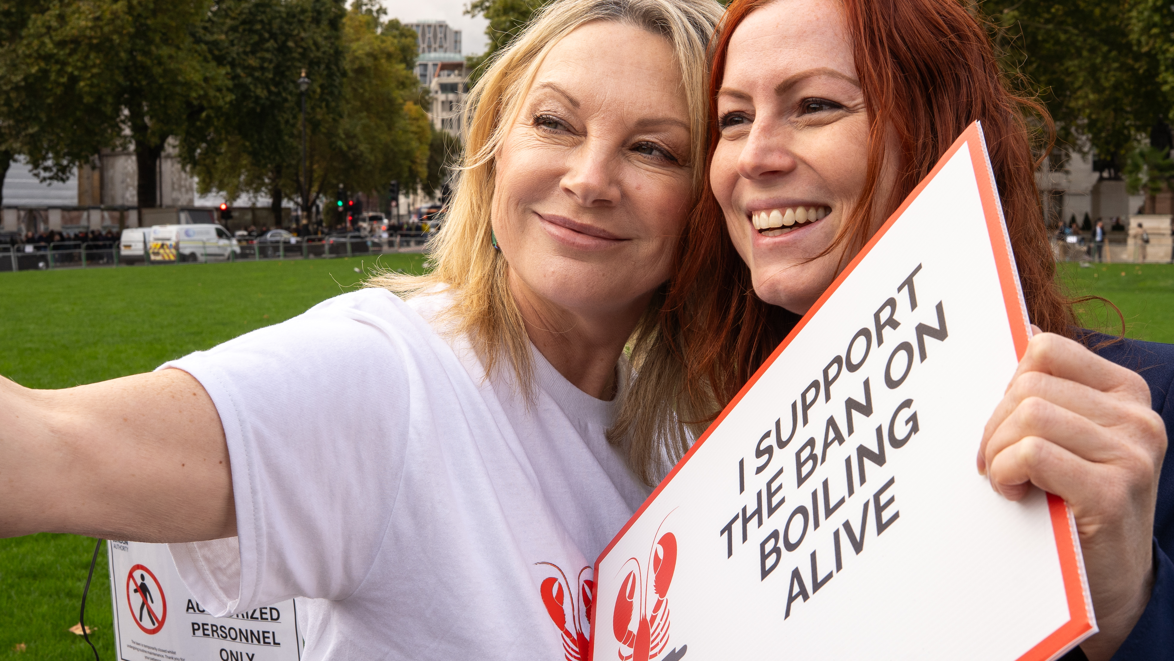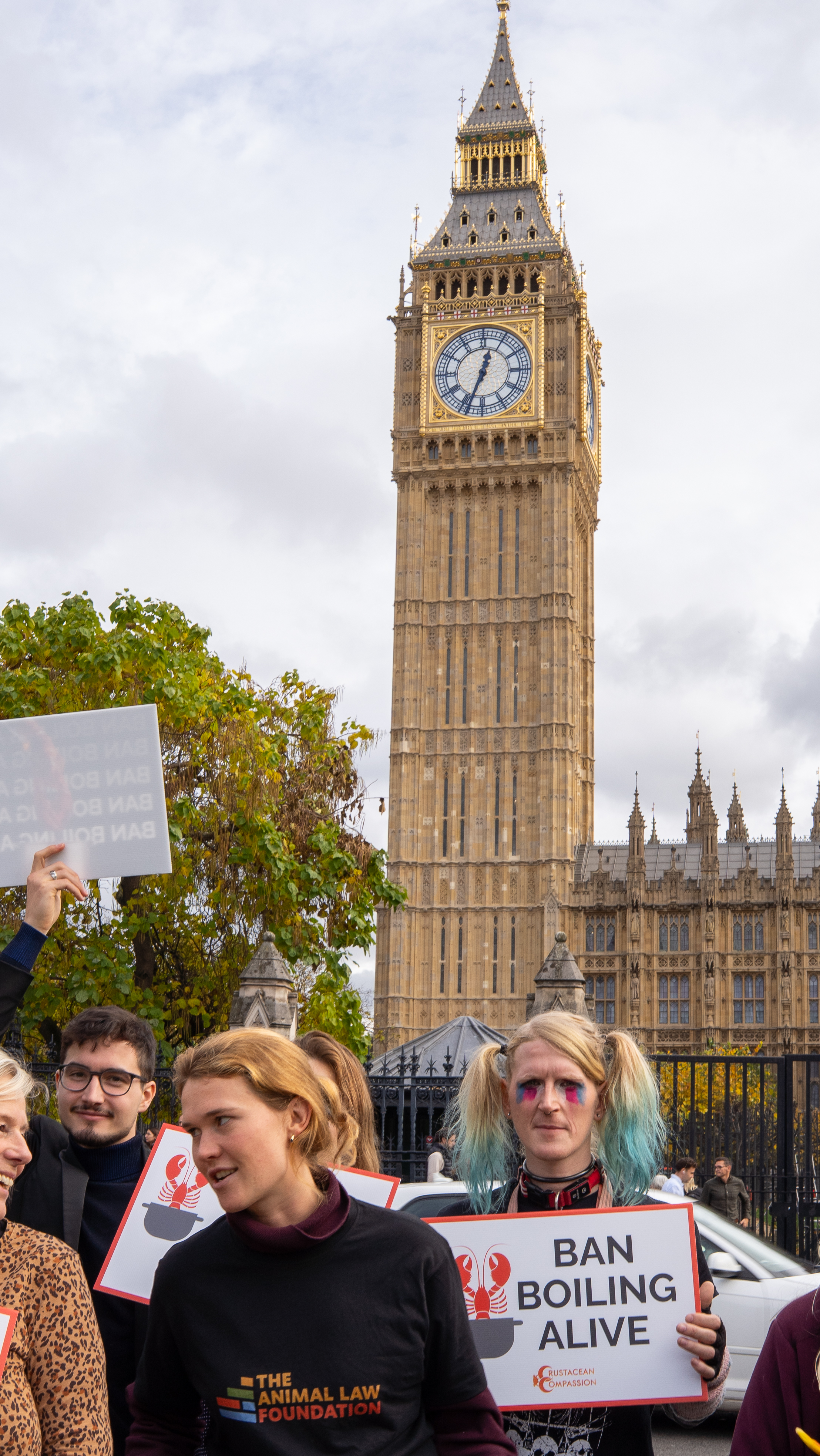Led by Crustacean Compassion, today activists, celebrities, and animal welfare organisations - including Compassion in World Farming, Animal Aid, Humane World for Animals and the Animal Law Foundation - gathered outside Westminster to turn up the heat on the UK government. Their message to newly appointed Defra Secretary Emma Reynolds was clear: to outlaw the painful and outdated practice of boiling sentient decapod crustaceans like crabs, prawns, and lobsters alive.