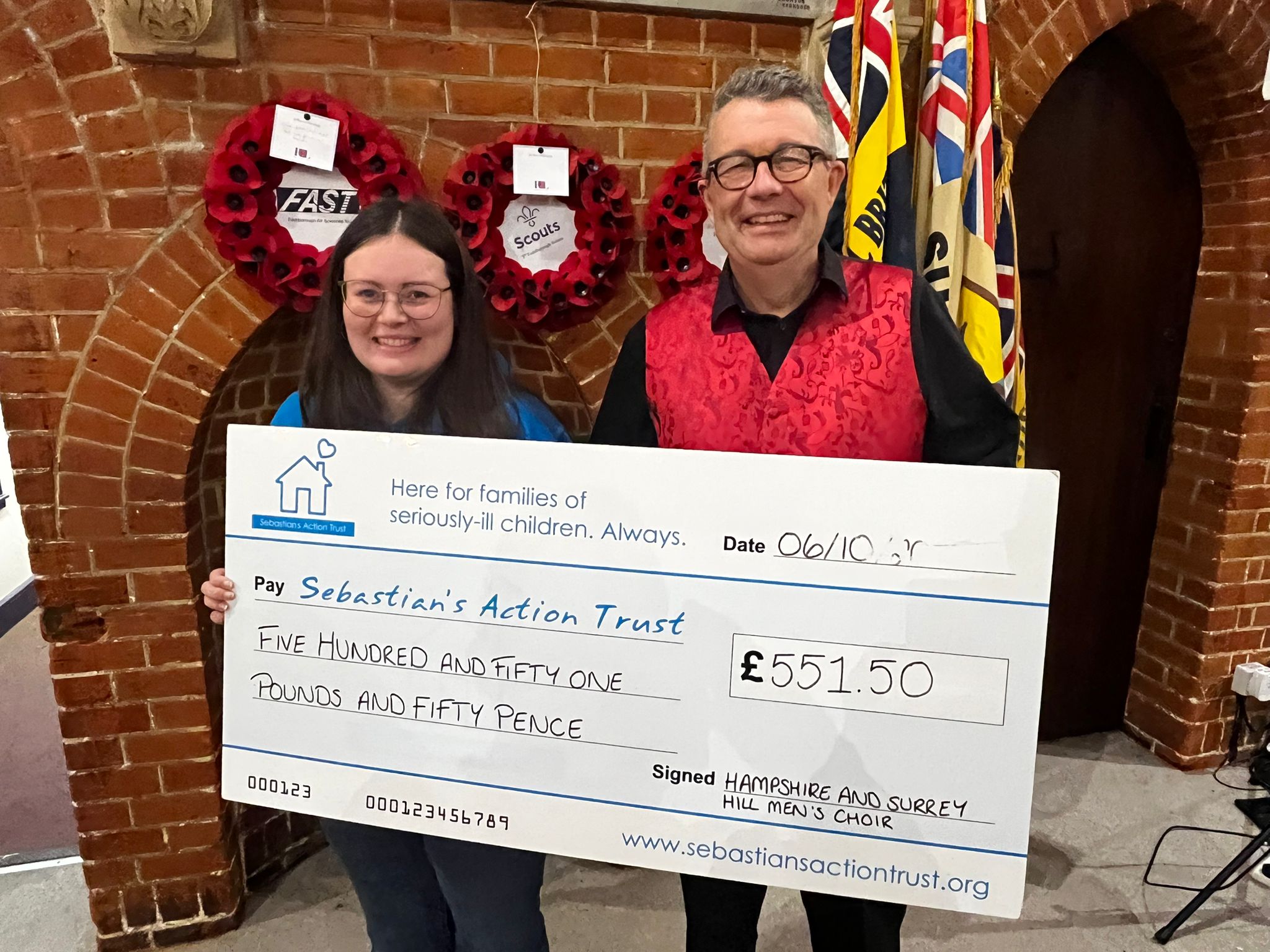 October 9, 2025 – At a recent rehearsal, Hampshire and Surrey Hills Men’s Choir presented the donations from their summer concert to Community Partnerships Fundraiser for the Sebastian’s Action Trust charity, Louise Gough.