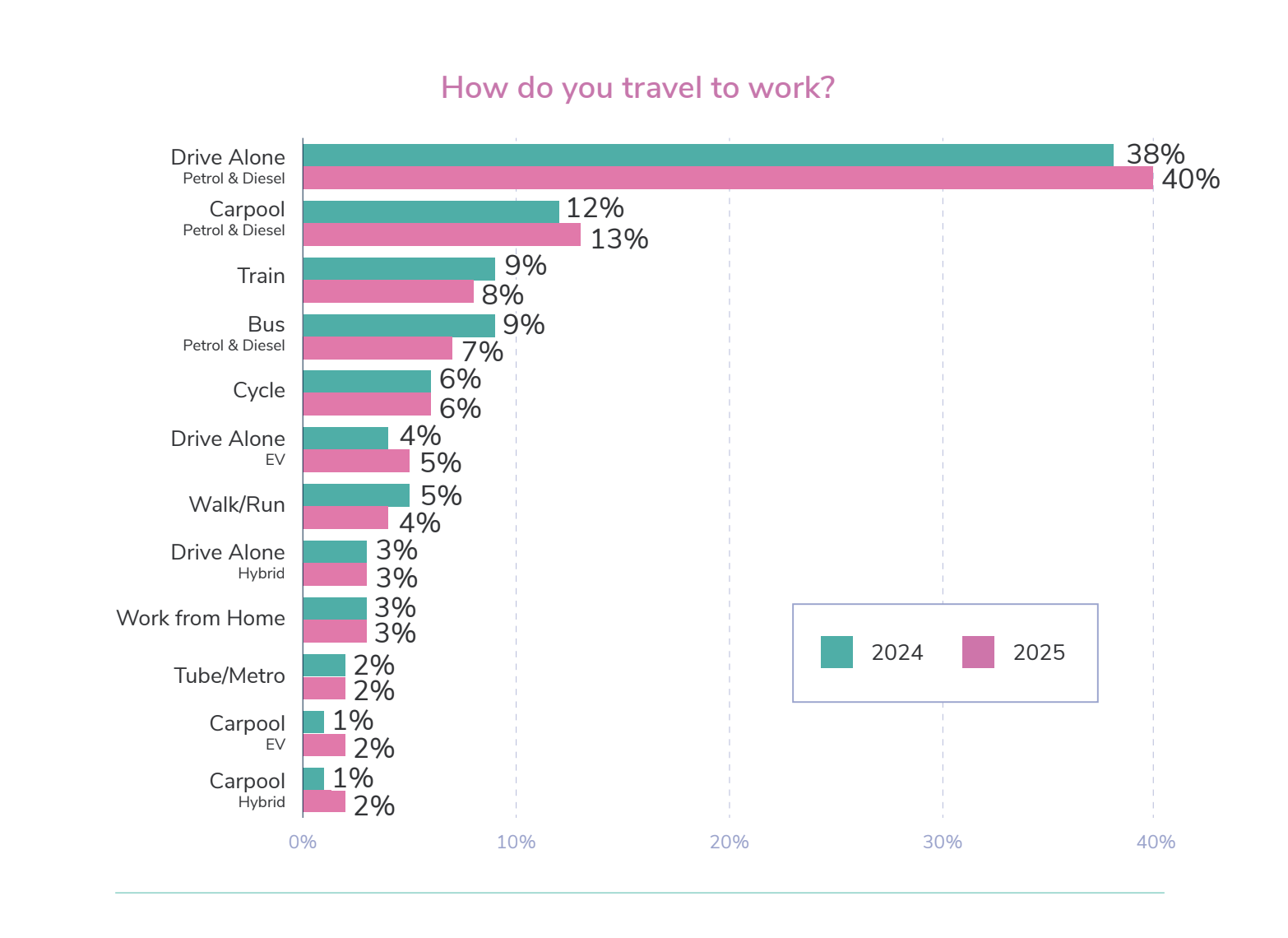 Only 8.1% of respondents now commute by bus (including EV bus), down from 9.9% in the prior year. This drop is particularly concerning given the UK’s net-zero ambitions and the role public transport must play in reducing Scope 3 emissions.