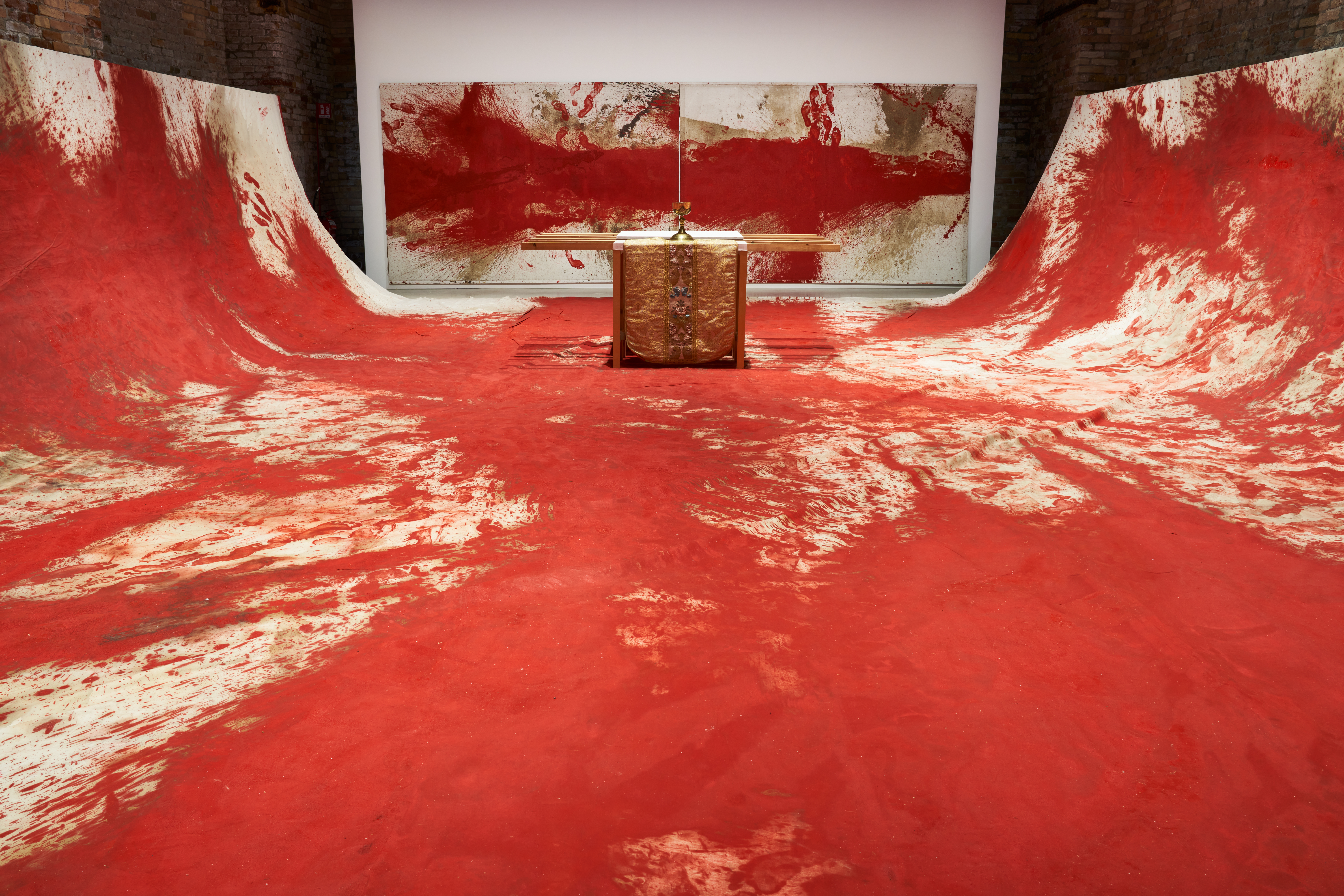 Executed in 1987 at the Wiener Secession, Vienna, the 20th Painting Action marks a decisive moment in Nitsch’s expansion of painting into ritualized, performative action. Distinguished by its monumental scale, material intensity, and performative origin, it remains the only complete painting action by Nitsch preserved as a unified ensemble. Its presentation at Officine 800 on Giudecca Island constituted the first major recontextualization of the work within an international biennial framework.
