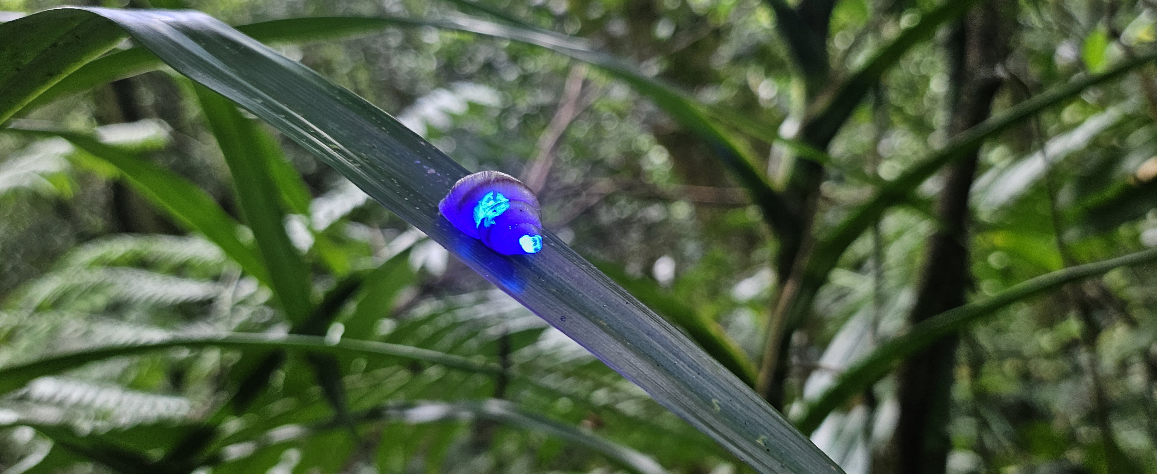 The UV-reflective paint not only helps conservationists find the snails nestled among the leaves and branches, but it also allows them to quickly tell apart released snails and their wild-born descendants.