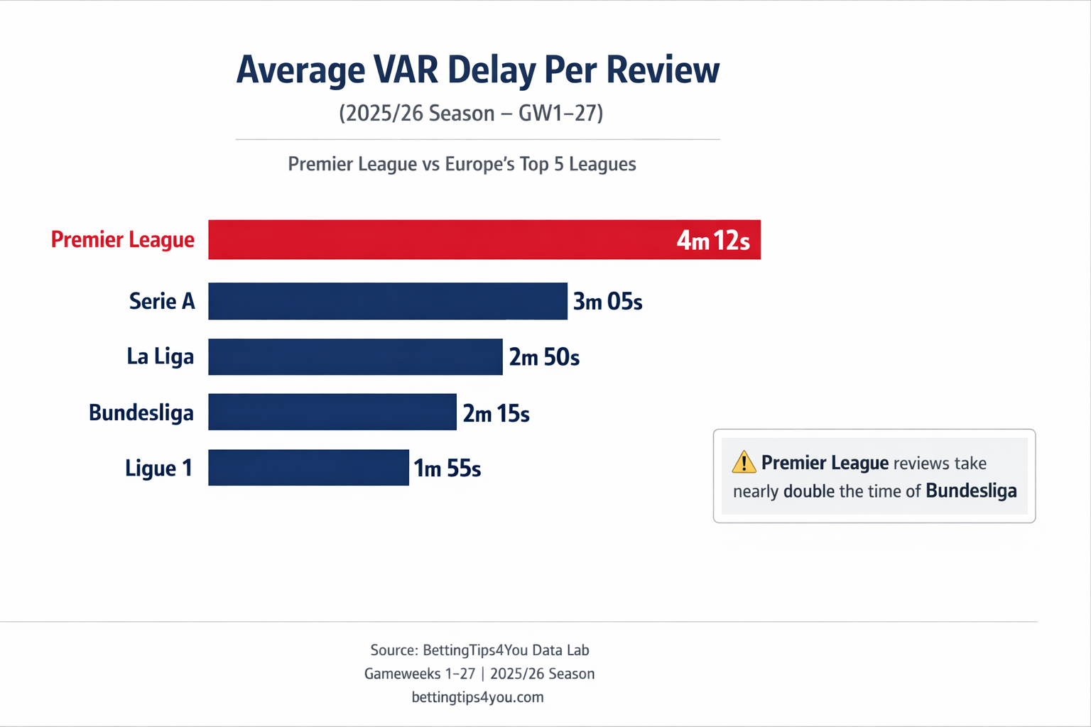 Premier League averages 4m12s per VAR delay — slowest in Europe, new 2025/26 data shows