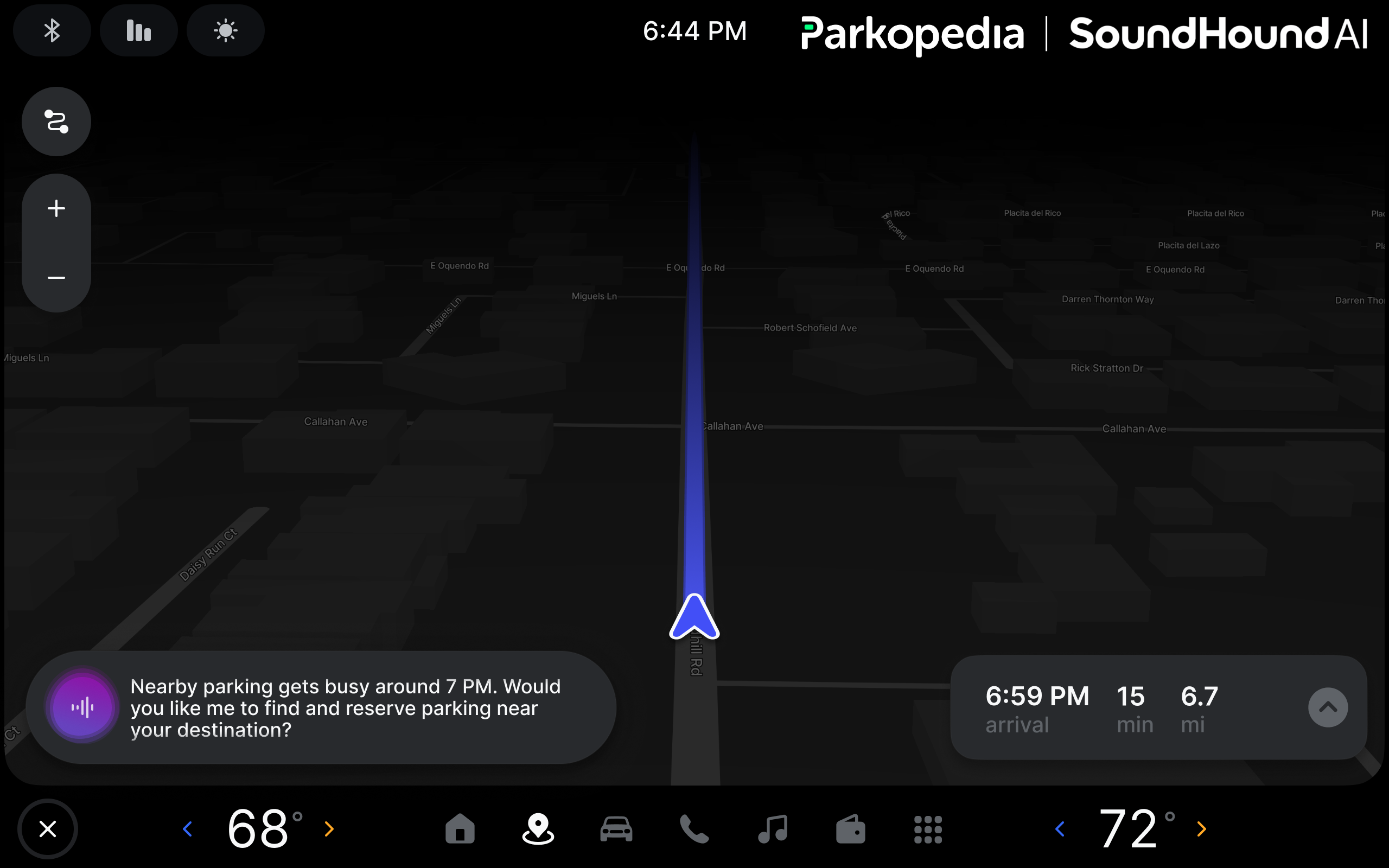- AI VOICE AGENT: “Navigating to Grand Central Market. Parking looks busy at Grand Central Market. Would you like me to find you available parking near your destination?”