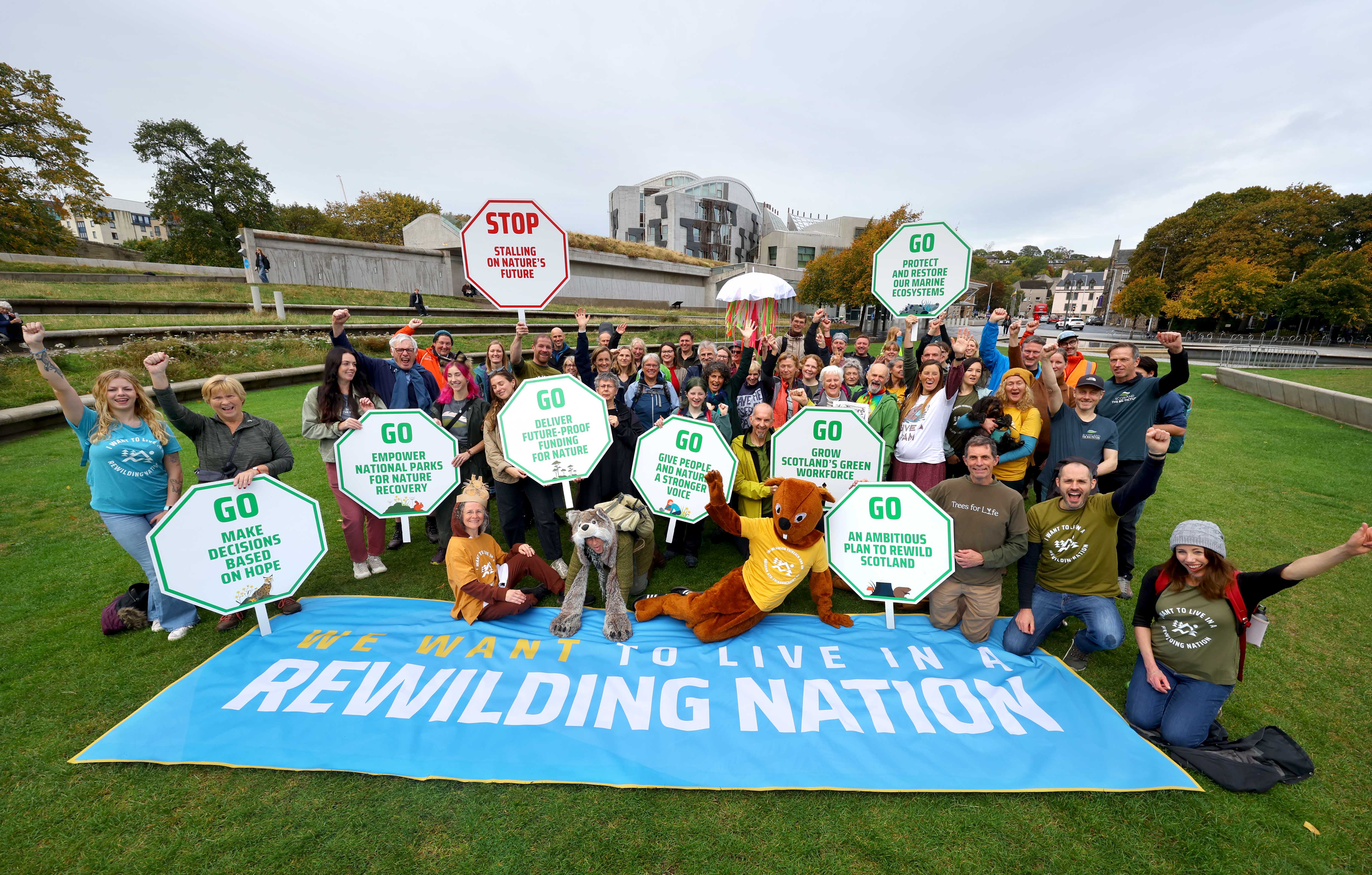 More than 100 people – representing thousands of individuals, charities, community groups and businesses from across Scotland – gathered outside the Scottish Parliament, with a visual display of ‘stop’ and ‘go’ signs exposing the barriers holding back rewilding and spotlighting the readily available solutions.
