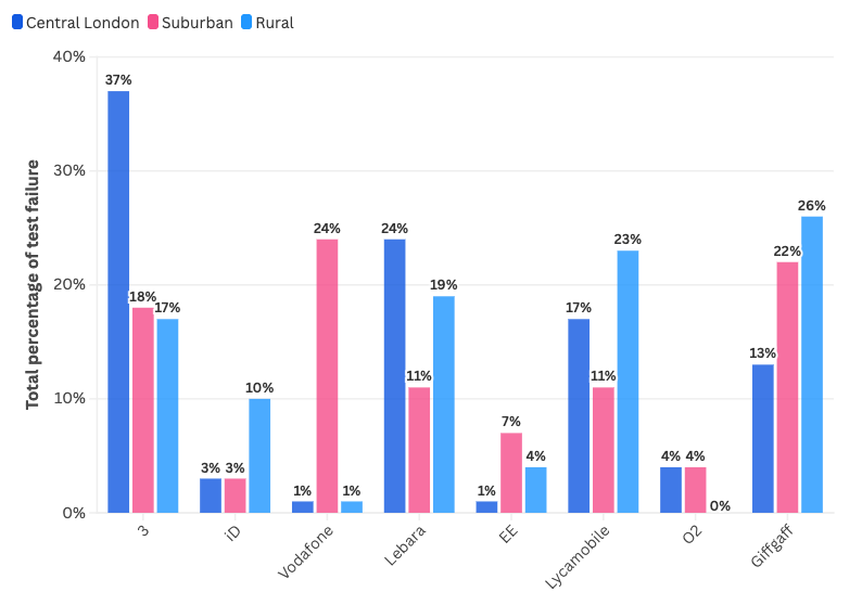 In the case of Vodafone, we experienced test failure in 1% of cases across our urban and rural test areas. On its MVNO Lebara, this rose to 24% and 19%. More noticeable was the difference between O2 and giffgaff, with only 4% average test failure across all O2 tests versus 43% average test failure on giffgaff - close to half.
