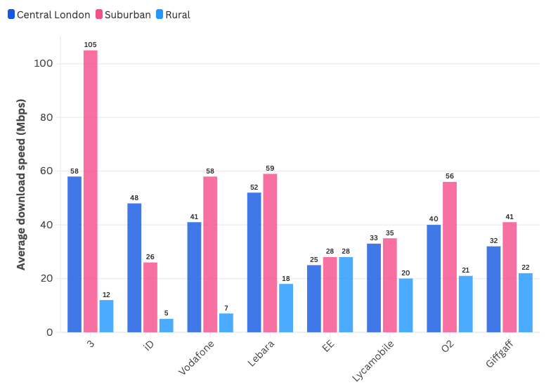 Our tests focused on Central London as an urban case study; south London and south Birmingham as suburban tests and the Isle of Skye, Lincolnshire and Cumbria for our rural tests. We found that in the urban and suburban tests, all networks are consistently achieving more than the 20 Mbps download speed needed for everyday usage.