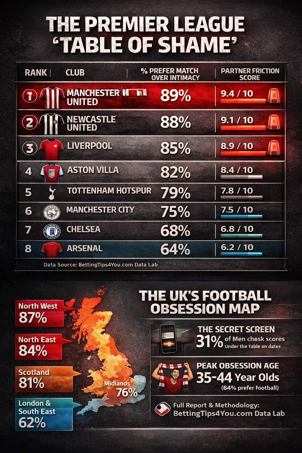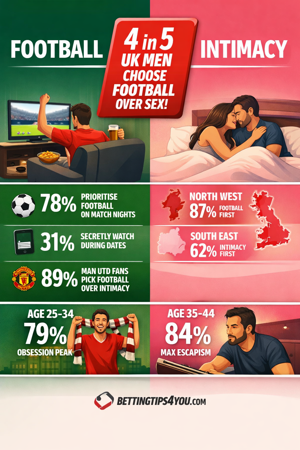 LONDON, UK — 4 March 2026 — Modern football fandom is actively sidelining romance across the UK. A controversial new study released today by the BT4Y Data Lab reveals that a staggering 78% of male sports fans would prioritise watching a football match over being physically intimate with their partner.