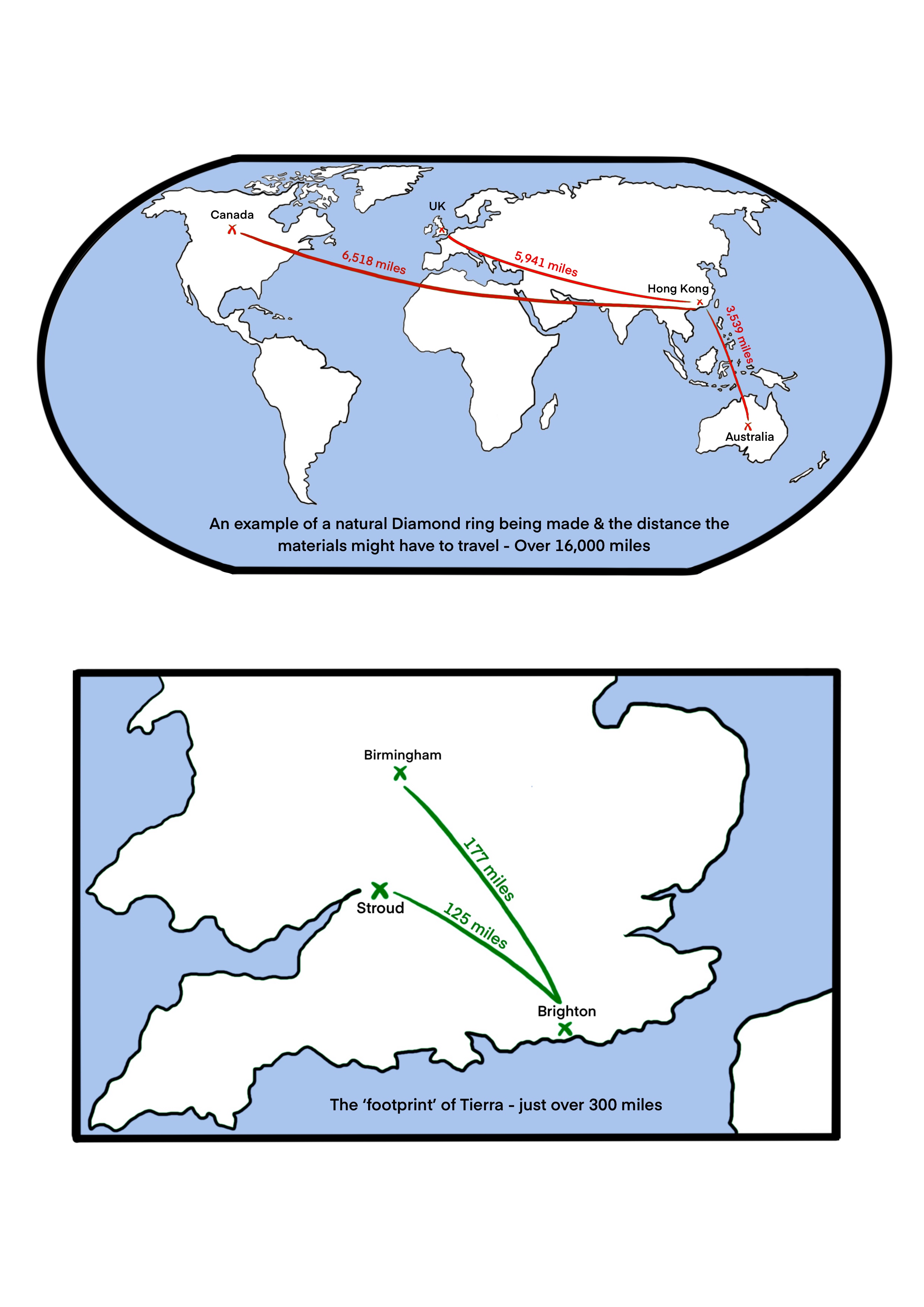 Carbon footprint. Another thing to consider is the thousands of miles that materials sometimes travel just to make one piece of jewellery. Gold from Australia, a Diamond from Canada, a ring manufactured in Hong Kong all then shipped to a retailer say in the UK for example. That’s over 16,000 air miles to make one piece of jewellery. So how does ‘Tierra’ compare? Well, the ring was designed in the UK in Brighton, the Diamond was ‘mined’ (from the sky) in The Cotswolds & the recycled gold was melted & cast in Birmingham. This equates to a total of just over 300 miles, none of which used jet fuel for air travel!