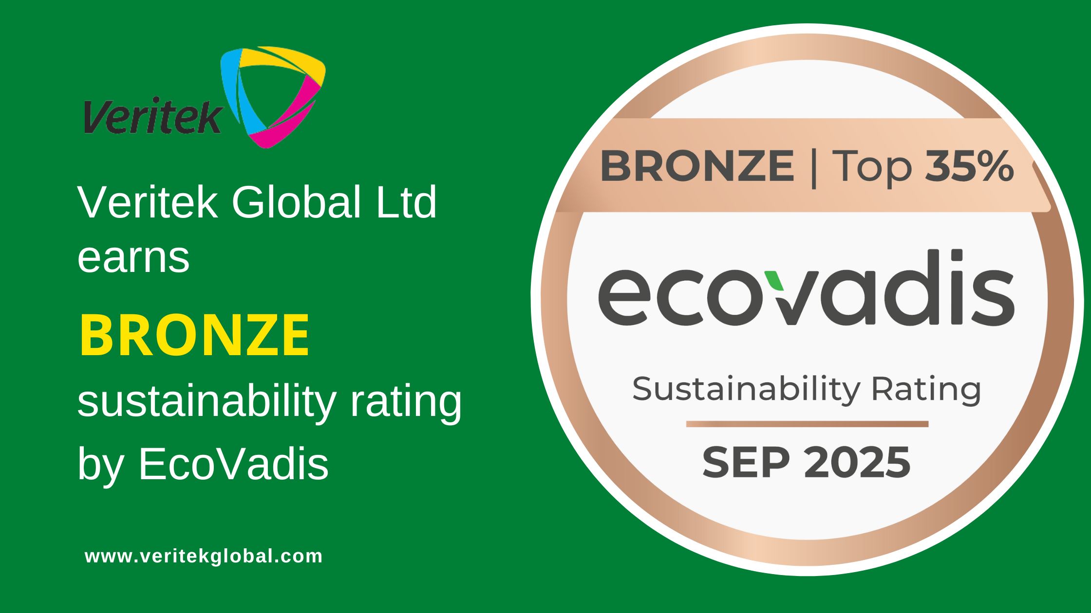 Veritek Global Ltd, a pan-European specialist in installation, maintenance, and repair of mission-critical equipment, is proud to announce that it has earned a Bronze Medal for Sustainability Management from EcoVadis, a globally recognised sustainability ratings provider.