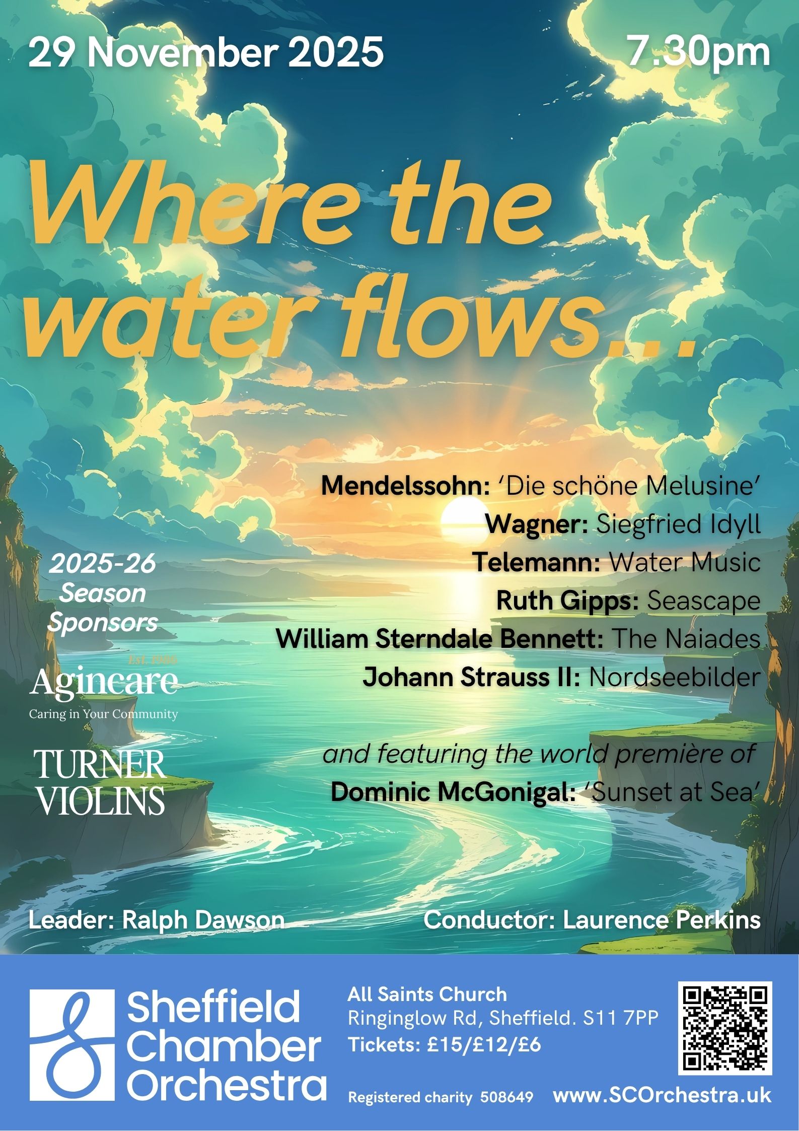 On Saturday 29 November 2025, join Sheffield Chamber Orchestra (SCO) in All Saints Church, Ecclesall for a special concert celebrating the themes of water, flowing motion and musical reflection — and marking the start of conductor Laurence Perkins’ second season as Artistic Director.